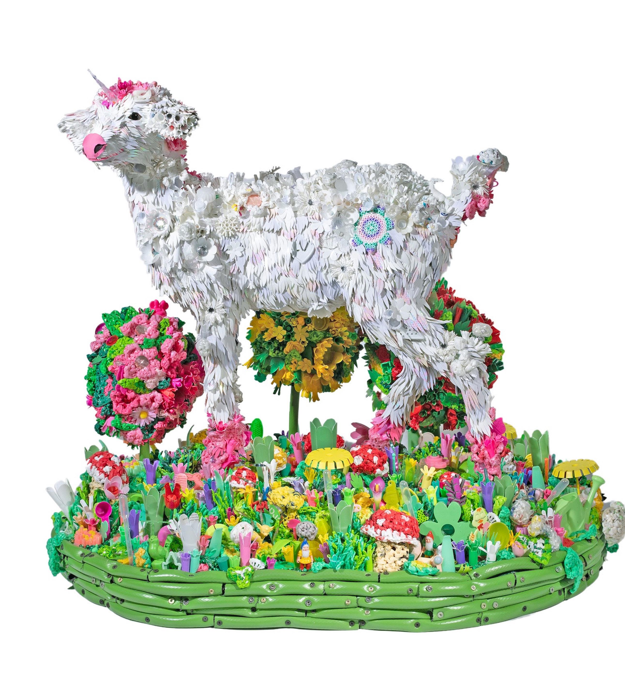 CALDER KAMINEnough is Enough, 2020, Koozies, caps and cutlery Recycled Unicorn Goat, 2020, Wood, hose, glass eyes, foam, koozies, marker caps, toys, various plastics, rubbishCrushed Cars, 2004 from Intolerable Beauty: Portraits of Consumption