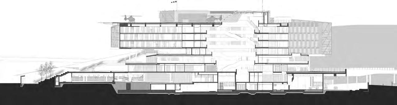 erzählt Christoph Pichler. Vor allem die Aufhängungsdetails für das ringförmige Fassadenschild und die massive Ausgleichsplatte in der letzten Etage – auch bekannt als sogenannte Trümmerdecke, die selbst einem herabstürzenden Sechs-Tonnen-Hubschrauber standhalten muss – hatten sehr komplexe Auswirkungen auf den Stützenraster im Gebäude. „Eines Tages war der Raster fixiert, und ab dann konnten wir im BIM-Modell keine einzige Betonsäule mehr verschieben. So geht’s einem als Architekt im eigenen Projekt.“