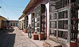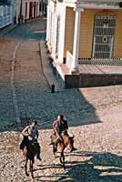 The highlight of our trip was Trinidad, a UNESCO World Heritage site. The town grew rich from the yield of sugar mills through the 19th century but then went into a long slumber. Anywhere else in the Americas such a gem would be a parking lot for cars and tour buses, and the main street would be lined with souvenir shops and plastic signs. Nothing disturbed the tranquility of Trinidad at sunset but a couple of cowboys from the sugar plantations clip-clopping over the cobbles, and some musicians warming up for an evening gig. Faces appeared behind the window grilles but the streets remained empty. Next day, the town came alive, and the architect who showed us the buildings he had restored stopped a hundred times to hug his neighbors. Here in the country, we could recapture the lazy, pre-revolutionary rhythms of Cuba, where people may make a living from the land and ignore the sloganeering. [2000–01]