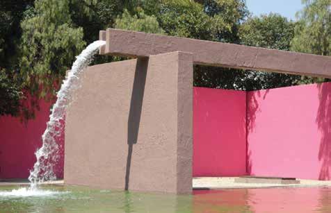 The Cuadra San Cristobal is located in a northern suburb of Mexico City. On the tedious drive out you pass the cluster of colored obelisks that Goeritz designed for Satellite City, another planned development that was hijacked by speculators. The Egerstroms, a Swedish couple who loved horses, commissioned a modest white house and an expansive stable yard in the gated community of Los Clubes. Pink walls are cut away to frame the house and are highlighted by panels of blue and violet, with a row of stables to one side. A cantilevered conduit gushes water into a shallow pool: an image that has long defined Barragán to the world. Just up the street is a similar spout and pool to serve horsey neighbors.