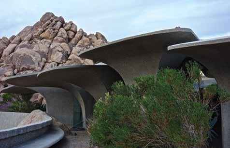 No contractor would assume responsibility for such an audacious design in so remote a location. Instead, the owners hired a supervisor and paid him for time and materials, without setting a deadline. A team of unskilled workers figured out solutions as they went along. It took three years to cut the rock, lay a concrete pad, and construct a driveway, while leaving many of the boulders in place. Twenty-six hollow columns are deeply rooted in the rock and fan out to form the overlapping planes that block the sun, while admitting refracted light through the glazed spaces between. Steel and concrete withstand the desert climate much better than wood, and neoprene joints allow the glass to expand. Terraces extend out to either side, shaded and protected by the house from fierce desert winds. There’s an architectural promenade from the road, up a winding paved path, and through the interior spaces to the wall of rocks behind. The house is a place of grandeur and mystery; a total work of art, seamlessly fused with nature at its most sublime.