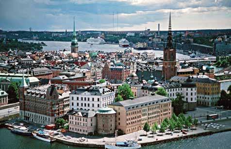Cruising around the waterfronts of Stockholm on a fine summer’s day is one of the most civilized pleasures I know. The city covers 14 islands of varied size, a tiny part of the archipelago of 24,000 rocky outcrops that extends from Lake Malaren out into the Baltic. The water acts as a giant mirror, intensifying the cool northern light, and enhancing the fanciful skyline. The islands break up the mass of the city, giving it an intimacy and charm that belies its size. Monuments—including the landmark City Hall and a forest of church spires—stand out boldly from streets and promenades of uniform scale and height. The cobbled lanes of the old city frame views of other islands, leafy parks, and an animated mix of ferries and sail boats. Though Stockholm has an abundance of restrained modern buildings, it preserves the rich character of earlier centuries in which architects competed to impress.