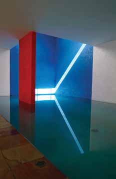 down a slope from the entry court to a pool court with rock outcrops. Light reflected off walls inflects their color, turning pink to pale blue-gray. The shifts of level and generous proportions, broad pine floor boards and massive wood furniture give this house the elemental quality that characterizes Barragan’s best work.