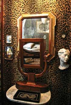 A vintage milking stool stands next to the thin-backed white chair it inspired. The dining room has an oval table supported on fluted classical columns, surrounded with Eero Saarinen’s tulip chairs. A German forest engraving frames classical doors. The bed is in the form of an Egyptian boat with mystical signs that indicate a voyage into world of dead. Velvet curtains can be drawn to close off each room. Claustrophobic and exhilarating by turns, the apartment is the embodiment of decadence and the free spirit of a true original. [2009]