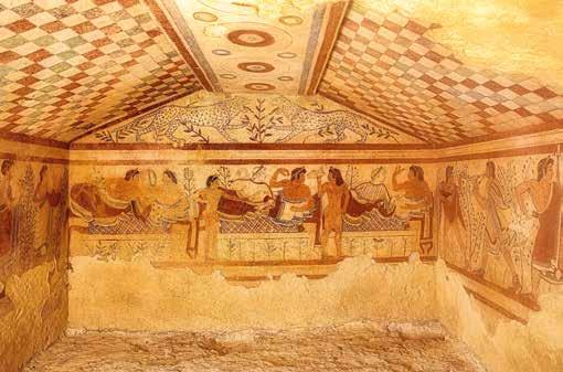 ‘Tomb of the Leopards’ (480–479BC) a banquet scene is topped by two heraldic leopards. Etruscans were skilled sailors and traders and revered the animals and wines they met on their travels.