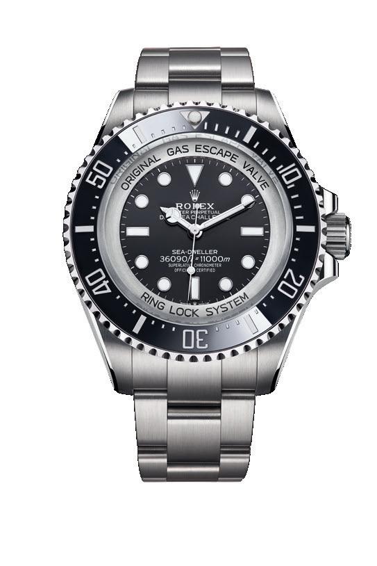 Oyster Perpetual Rolex Deepsea (44 mm), guaranteed waterproof to a depth of 3,900 metres (12,800 feet). This ultra-resistant divers’ watch benefits from three Rolex innovations: the Ringlock system, an innovative case architecture; the Chromalight display, introducing an exclusive luminescent material emitting a long-lasting blue glow; and the Rolex Glidelock bracelet extension system.