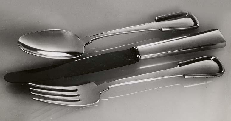 164 Zeichnung von Löffel, Gabel, Messer (Muster X) mit aufgelegtem Monogramm W., Heilbronn, ca. 1928–1933; Jüdisches Museum Berlin, Inv.-Nr. 2015/1843/41; Schenkung von Evelyn Grill-Storck in Erinnerung an Prof. Dr. Joachim Wolfgang Storck