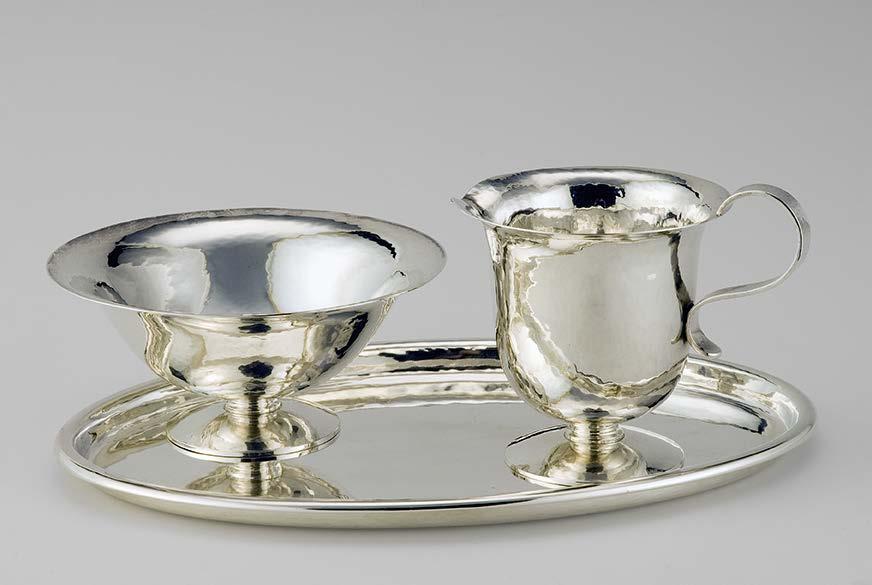 79 Rahmgarnitur, Modell 12962, Entwurf Paula Straus, Herstellung Peter Bruckmann & Söhne, Heilbronn, 1926, Silber gedrückt, gehämmert, H. 9,8 cm (Rahmkännchen), H. 6 cm (Zuckerschale), L. 25,5 cm (Tablett); Marke: Mond, Krone, 835, G. v. Berge (Juwelier) sowie II (Formangabe); Privatbesitz