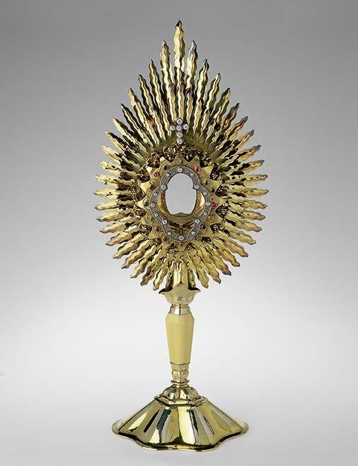 189 Monstranz, Entwurf: Josef Michael Lock und Paula Straus, Herstellung: Paula Straus und Werkstatt Peter Bruckmann & Söhne, Heilbronn, Sonderanfertigung 1926, Silber, vergoldet, Elfenbein, Smaragde, Rubine, Saphire, Bergkristall, H. 65 cm; Marke: Mondsichel, Krone, 800, Adler; Katholische Kirchengemeinde St. Augustinus, Heilbronn
