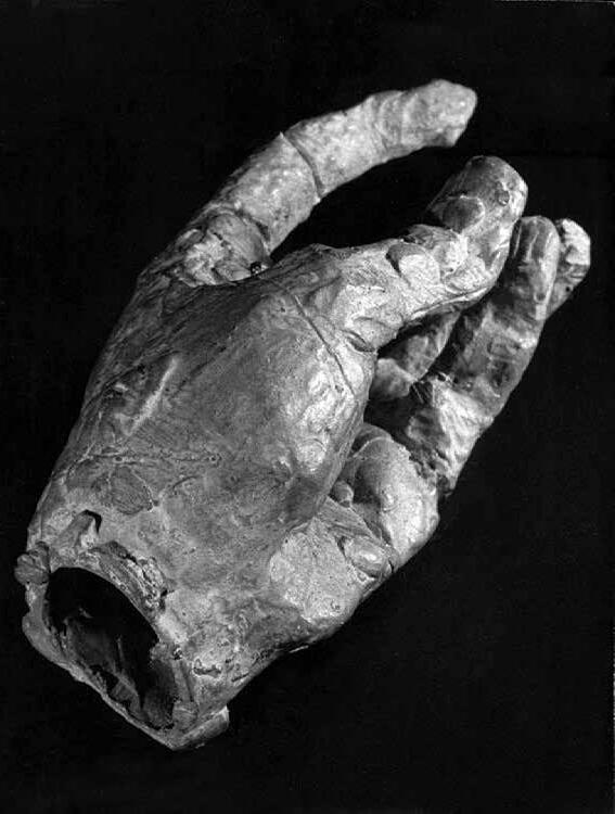 At first glance, Head and Hand I (1969) seems abstract. From a specific vantage point, however, Ruth’s pose rushes into view. De Monchaux built the work in clay sections without an armature, the final form only materialising after bronze casting. This ‘blind’ and additive process, coupled with the spontaneous handling, suggests an ongoing fascination