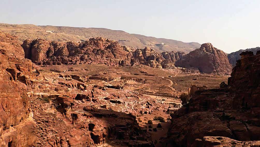 archaeology teams conducting research in Petra. Across the valley (bottom right), the Basin Restaurant offers visitors traditional Jordanian meals or respite on their large veranda, whose copious voluminous trees provide an unexpected, but much appreciated, oasis from the harsh desert sun.