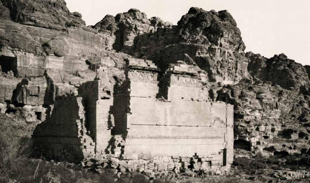 “In the wall of al-Khubdha [al-Khubtha], stands a very badly weathered monument, generally called the ‘Corinthian’ tomb from the fact that the capitals of its columns are––or supposed to have been––of the Corinthian order. Next to this, northwards, stands an immense façade, unique in its design as regards Petra, which is a copy, in arrangement,