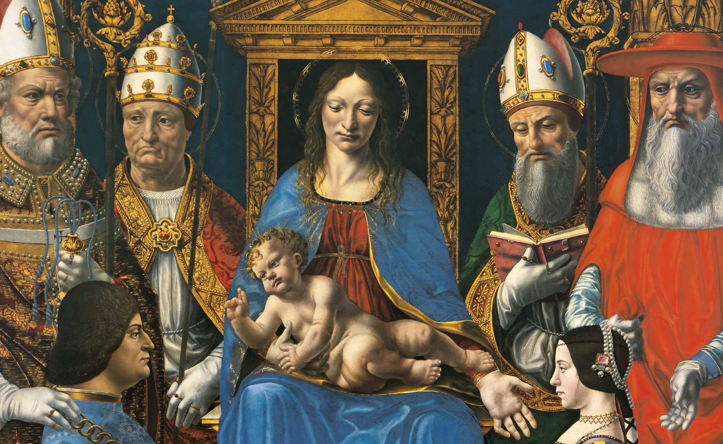 The masterpiece by Ferrara-born Ercole de’ Roberti is the so-called PortuenseAltarpiece, commissioned by the Lateran Augustinian canons for the high altar of Santa Maria in Porto Fuori, Ravenna, in order to celebrate the founder of the basilica and of the order, the Blessed Pietro degli Onesti, who miraculously escaped a shipwreck in 1096 near the port of Ravenna, on his way back from a pilgrimage to the Holy Land. Overwhelmed by the storm, Pietro degli Onesti in his prayers for salvation had in fact promised the Virgin that he would dedicate a large church to her: the memorable view depicted in the altarpiece, inserted between the base of the pedestal and the throne platform, seems to evoke the miraculous episode. In the sixteenth century, the work passed to the church of Santa Maria in Porto within the city walls, following the transfer of the canons. Payments for the work date back to 1481, which is fixed as the terminus ante quem for the execution of the monumental unified space altarpiece. The tabernacle-like throne of the Virgin, almost composed of a kaleidoscopic prism, opens up to unexpected visions, allowing itself to be pierced by a gap that connects the illusory space of the cross to the focused lunge over the harbour landscape, with a city overlooking the sea moved by the waves, immersed in the distance in golden mists and threatened by a coruscating sky. Tapered polychrome columns, marked by eccentric capital elements, create a diaphragm capable of connecting and supporting the structure without interrupting the gaze, which can linger in the vision of the unusual landscape motif, central to the composition and conceptual level. The platform is articulated in bas-reliefs with a gold background in which four monochrome scenes are visible, amidst ‘excruciating and spirited motions’ and ‘petrified action’ (Longhi, 1934): Nativity (or Adoration of the Shepherds), overlaid with Saint Augustine’s cloak to obscure part of it, Massacre of the Innocents, Adoration ofthe Magi and Circumcision. On the front, a motif of pictorial virtuosity also emerges, with the depiction of the carpet (of a type that can be associated with those with a single Holbein gul) whose fringes descend downwards, drawing a lively grid of naturalistic mimesis, such that even the twisting of the threads can be captured. On the octagonal podium rises a monumental, almost statuesque triad, composed of the saints and, at the top, the Virgin, luminous in her Piero della Francesca’s geometric volumetry, while holding on her right leg up the lively standing Child, who supports himself by resting his small left hand on that of the Mother. Next to her, Saint Elizabeth establishes a dialogue with the Saviour that is as affectionate animated by glances and centred on the goldfinch, as it is dramatic in its foreboding. On the right, Saint Anne in prayer joins her hands, arching them as if to protect and foreshadow, turning towards the observer. The pyramidal structure articulated by the figures, with the Madonna at the apex, is clasped at the base by Saint Augustine, patron of the Lateran Canons, almost blessing and with his head half in shadow angled towards the faithful, and by Blessed Pietro degli Onesti immersed in reading, wearing a canon’s habit. The two advance on the plane, casting dynamic shadows, even on the plinth of the pedestal, in front of the pillars decorated with antique candelabra reliefs on which the arch decorated with cherubs’ heads variously arranged, oriented and moved by the changing incidence of light. Beneath the airy cross vaulting curves the canopy of the throne, substantiated by transparent glass reflecting the light and possibly alluding to the purity of the Virgin. The solemn layout of the baldachin, like an Epischopal Chair, rises majestically amidst sumptuous chain decorations and eight overlapping slabs of gilded monochromes: with felicitous solutions and perspective inventions, they illustrate, from the left, in the upper register Flight into Egypt, Presentation in theTemple, Christ among the Doctors, Baptism ofChrist; in the lower register, Kiss ofJudas, two episodes (possibly Pietà and Christ in Limbo) partially covered by the silhouette of the Virgin, and finally Noli me tangere. On the sides, the throne is limited by columns similar to those shielding the seascape, amidst porphyries and serpentines, while the back is modelled as a niche to envelop the Mother of Christ and Mater Ecclesiae. Two scenographic drapes open and arch gathered at the sides, also suggesting an emblematic continuation stretched upwards without interruption. A sparkling arrangement of warm colours, from red to yellow to gold, blends with mimetic hints of painted sculpture, in the bas-reliefs simulating bronze reliefs and in the tabernacle, as well as in the spandrels of the arch, where two vibrant and severe nudes stand out and crouch against golden mosaic tiles: on the left Samson with the donkey’s jawbone with which he defeated the Philistines, and on the right the prodigious David with the head of Goliath, still wielding the sharp sword to foreshorten the fatal blade. The skilful architectural construction is mounted in an environment on the borderline between closure and openness, between the tight marble floor on the threshold of the first floor and the distant sea and atmosphere.