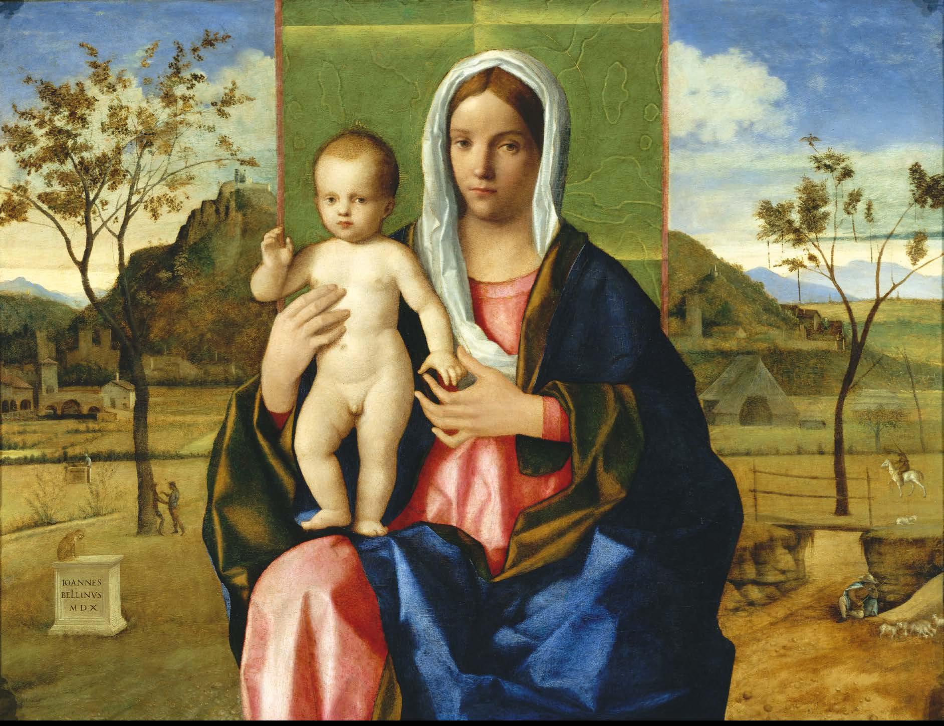 L’invito a contemplare «quei segni dell’eternità nelle gemme del Bellini» fu espresso da Testori nel 1986 in occasione del restauro dei due dipinti di Giovanni Bellini ora a Brera raffiguranti la Madonna con il Bambino. Il quadro datato 1510 è riconoscibile nella descrizione di Oretti del 1769 in Palazzo Monti a Bologna; fu poi di proprietà Sannazari, da cui passò nel 1804 all’Ospedale Maggiore di Milano; nel 1806 fu acquistato per l’Accademia di Brera. Nonostante il trasporto da tavola su tela (attuato nel 1893, ma già Morelli nel 1861 ne lamentava lo stato conservativo), la pittura testimonia la piena ricchezza cromatica distesa da Bellini sull’appunto disegnativo sottostante, contorno compendiario di forme, ravvisabile nella Madre e nel Bambino, «quasi che, giunto al culmine della propria parabola, il maestro vivesse il colore (il colore della luce, ma anche il colore nella luce) come strumento totale», tanto da arrivare in alcuni punti a stendere «la materia direttamente con le dita, come testimoniano l’orme, visibilissime, sul dilontanante paese», nella lettura di Testori. L’intensità luminosa sottolinea il gruppo figurale, rilevato contro un autonomo «drappo d’onore», mentre il paesaggio dal primo piano procede sino all’orizzonte al crepuscolo. Risalta sulla sinistra un animale maculato sovrastante l’ara iscritta con la firma e la data; sulla destra si scalano un pastore con il suo gregge e una pecora isolata, un cavaliere e un uccello intrappolato fra le panie sull’albero. Tra simboli e presagi, s’impongono monumentali la Madre con il Bambino benedicente. Per il ghepardo sull’ara antica, Giovanni Agosti ha richiamato non solo modelli dagli album di Jacopo Bellini, ma anche da taccuini tardogotici. Marcantonio Michiel nel 1530 segnalava «el libretto in quarto in cavretto cum li animali coloriti fu de mano de Michelino Milanese», Michelino da Besozzo, nella collezione veneziana di Gabriele Vendramin, che includeva anche dipinti di Giovanni Bellini, nonché il Libro dei disegni di Jacopo Bellini ora al British Museum di Londra.