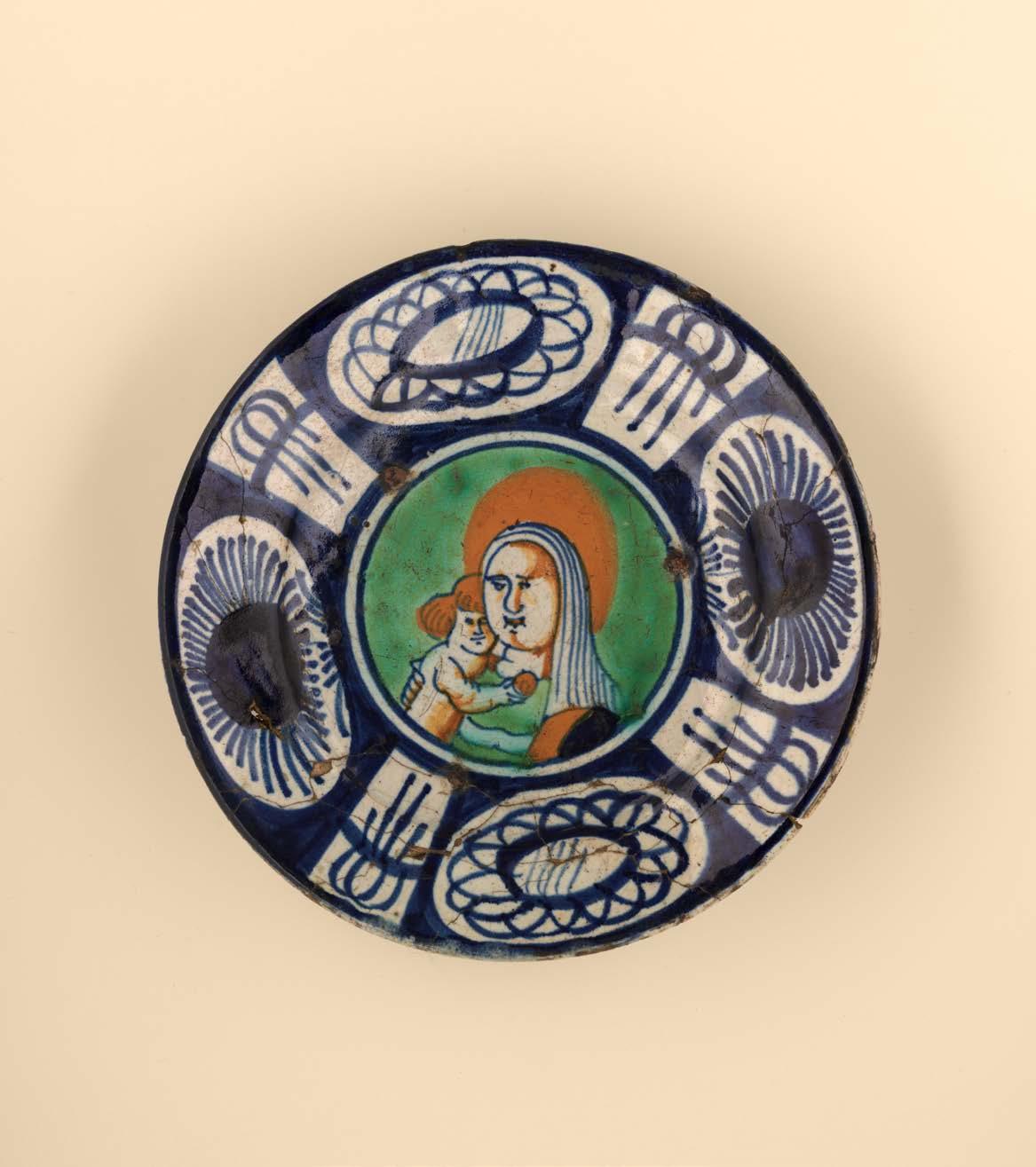 This early 17th-century dish combines a border inspired by Chinese Kraak porcelain with the typically Christian motif of the Virgin and Child. Two cultures meet.