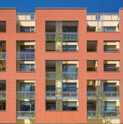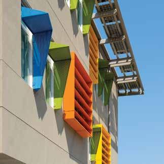 onto views and introduce daylight. Many of the apartments have balconies that are recessed into the building mass. On the south (red) facade, the alcoves help mitigate the visual and acoustic impact of the adjacent freeway while providing solar shading. A variety of openings and plant-supporting mesh panels provides a composition that can be read from the freeway. On the north (green) facade, the pattern of openings is compatible in scale and variety with the adjacent residential neighborhood. The building’s color scheme, inspired by the bold and bright colors found in the neighborhood, accentuates the separation between the two bars of apartments and between the outer building skin and the setback balconies and voids.