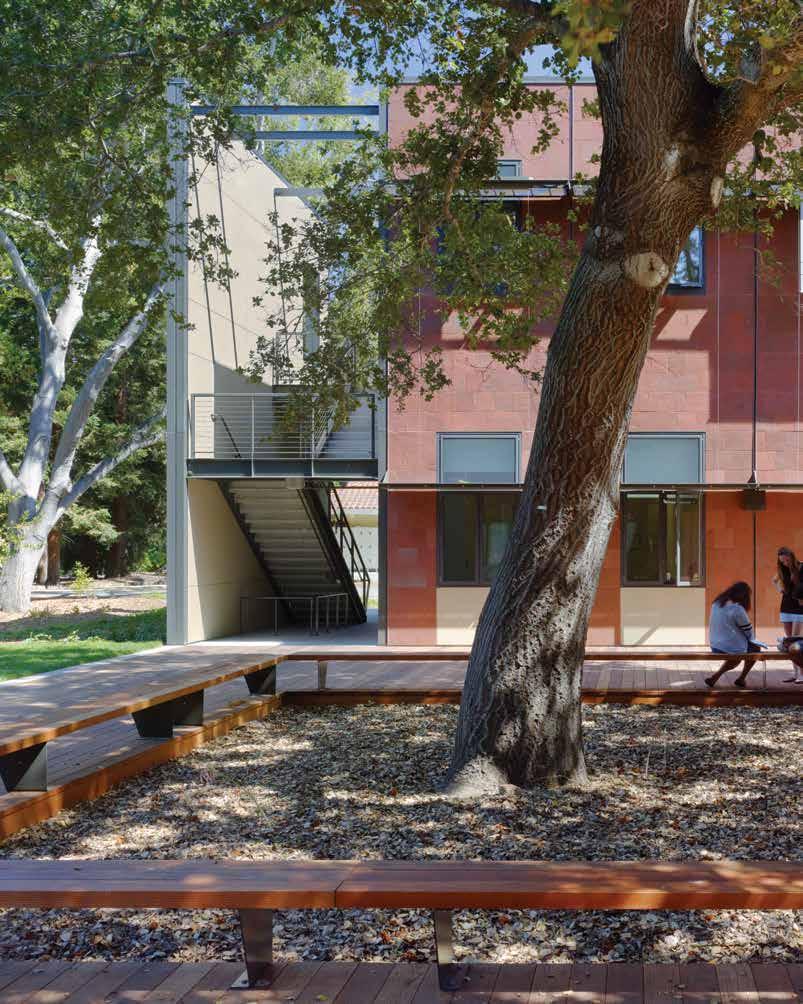 Michael J. Homer was an early Silicon Valley pioneer who played an important role in the development of the personal computer, the internet, and the handheld digital device. In honor of him and as a reflection of the innovative Silicon Valley culture he helped to create, the Homer Center brings together science, nature, and community in one unique educational environment. We positioned the building to help link an adjacent gymnasium and classroom buildings with the Main Building. The center’s east–west orientation optimizes pedestrian circulation around the site, allows for passive solar design, and brings in daylighting and natural ventilation. We arranged important community rooms—the student life office, the dining hall, and the auditorium—on the first floor of the building and wrapped these around a courtyard with a large native oak tree. Together, this forms an indoor-outdoor hub of campus life. The building skin is made of red slate panels that are similar in height, proportion, texture, and color to the red brick of the Main Building nearby. Lightweight steel sunshades articulate the facade and provide daylighting control and weather protection.
