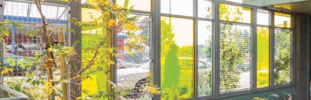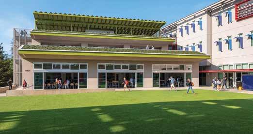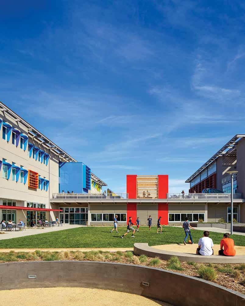 Simple, costeffective strategies and systems demonstrate advanced resource efficiency and low-carbon living. We designed the school to reduce its energy use 65% from baseline, which exceeds the AIA 2030 Challenge. The building envelope utilizes standard materials and systems to achieve a performance 20% better than California’s Building Energy Efficiency Standards. Five threestory chimneys punctuate the north wing and provide fresh air and light at its center as well as views between floors. Instructional spaces are primarily naturally ventilated, augmented by ceiling fans in warm weather. Photovoltaic arrays provide nearly 20% of the school’s energy. Nueva School at Bay Meadows embodies the ideal of school as an ecology of learning. It supports the development of “creative, resilient, thoughtful leaders and collaborators who are ready to solve problems and have an impact on the world.”23