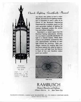 firm’s lighting division, begun in 1919, are revealing on several levels. They reflect trends in the technology, inventions, design materials, manufacturing processes, and fabrication techniques. They show a range of aesthetic approaches, varying types of lighting solutions, and social and historical developments in architecture as well as preservation and restoration. These threads constitute a whole cloth, with technical, practical, and artistic outcomes, showing that Rambusch lighting is an innovative industry leader committed not only to art but the needs of its clients.
