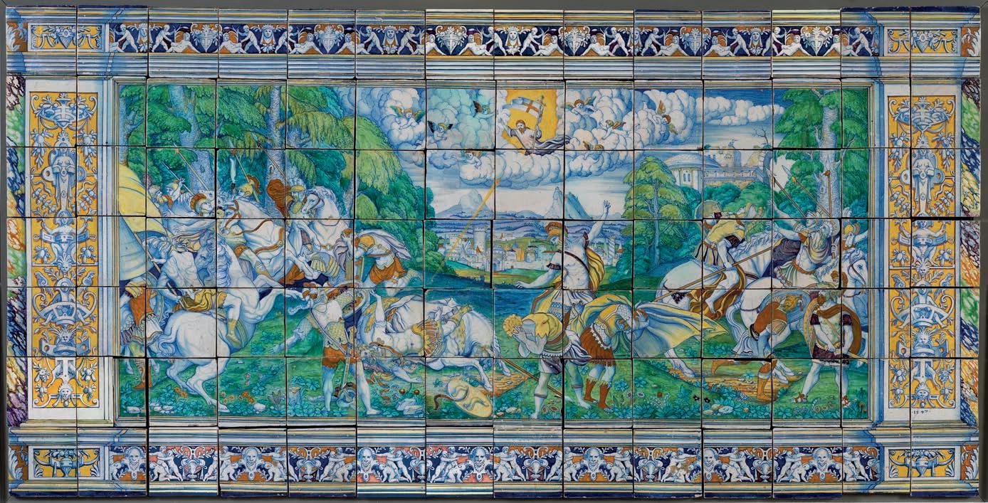 Dit fraaie veelkleurige tegeltableau trekt de kijker mee in een dramatisch Bijbeltafereel: de bekering van de christenvervolger Saulus. Saulus is op weg van Jeruzalem naar Damascus wanneer hij, verblind door een bliksemschicht, van zijn paard wordt gegooid. Het is God die dit vanuit de wolken veroorzaakt. Ook Saulus’ medereizigers en hun paarden reageren verschrikt en zoeken bescherming. In de achtergrond van het bosrijke landschap doemt een stad – Jeruzalem? Damascus? – op. Saulus’ val van het paard, zijn visioen van de goddelijke interventie leidden tot de bekering van de christenvervolger die vanaf dan als apostel Paulus het christelijk geloof zou verkondigen. Het grote rechthoekige tableau bestaat uit 98 vierkante majolicategels. Majolica, veelkleurig geglazuurd aardewerk, was begin zestiende eeuw door Italiaanse ambachtslui in Antwerpen geïntroduceerd en groeide er uit tot een bloeiende kunstnijverheid. Het Saulustableau is het enige intact bewaard gebleven voorbeeld uit de renaissance. Het kleurenpalet is uitbundig: boven op de tinoxide