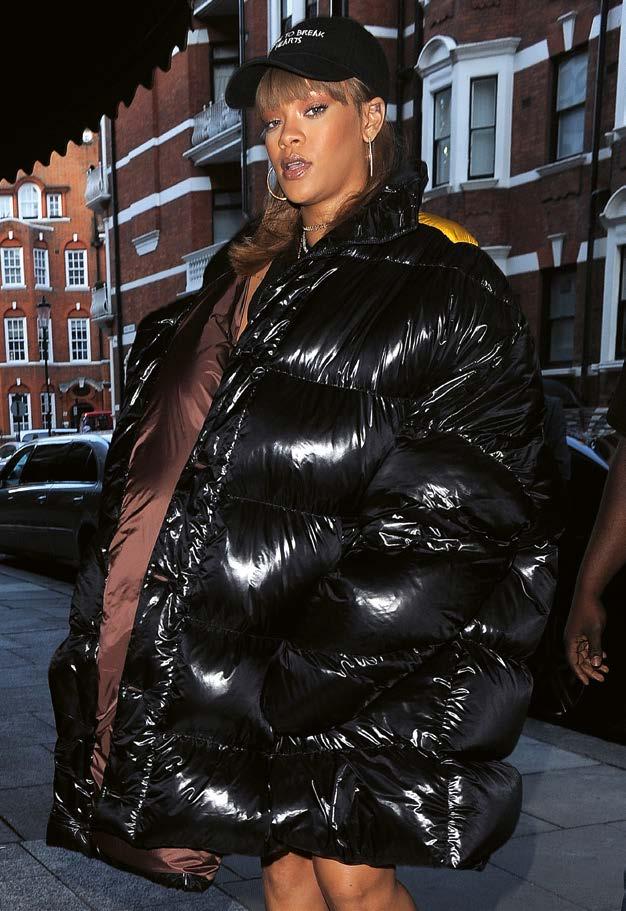 One favoured BadGal puffer is a wet-look jet and yellow knee-sweeper designed by Raf Simons for his autumn 2016 menswear collection. She wore it in London, styling it with Fenty X Puma boots and crew socks, making quite a statement. And when it came to her first public appearance since the birth of her first child, in July 2022, the fly-girl stepped out in a feathered Prada puffer bomber jacket to watch ASAP Rocky play at Wireless Festival in London.