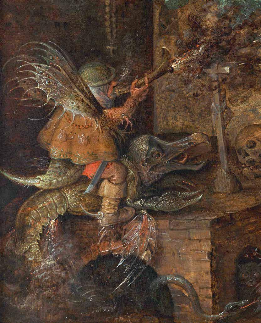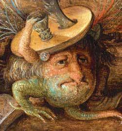 Apart from the hybrid beast with the dodo head, another remarkable monstrosity draws attention: a winged head with limbs, arm, tail, foot, claw, and a table as headgear (fig. 13). This peculiar figure also finds its origins in the repertoire of Bosch and Bruegel. Notably, the face of this creation bears a resemblance to none other than Rudolf II (fig. 14). This is particularly puzzling. Is Rudolf II being made fun of here? 96 Could this possibly be a satirical allusion to the mental state of the emperor, who in the later years of his life delved ever deeper into occultism, alchemy, and black magic? It is almost inconceivable to think that Savery would openly ridicule his lofty patron in such a manner, yet the resemblance is unmistakable. Perhaps this small painting was intended solely for the private use of its unknown owner and not meant for public view. Is it possible that Savery fashioned this painting for himself as a souvenir of his Prague years?
