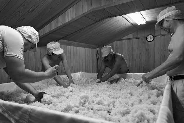 The enzymes for converting starch to sugar for fermentation by the yeast come from the kōji mould. The next step is critical in ensuring that each rice grain so treated emerges after the two-day process with its starch duly transformed. Between 20 and 25 per cent of the total amount of rice destined for fermentation is treated to create kōji, or rice kōji. It is taken to the kōji room (kōji-muro), and spread out on tables where, after it’s sufficiently cooled, it’s sprinkled, as if by a priest waving incense, with the yellow kōji mould. Semi-religious as the process may be, the difference is that as the kōji-muro is at near-sauna temperatures: staff strip to the waist and knead until every rice grain is inoculated before being bundled up to keep warm.