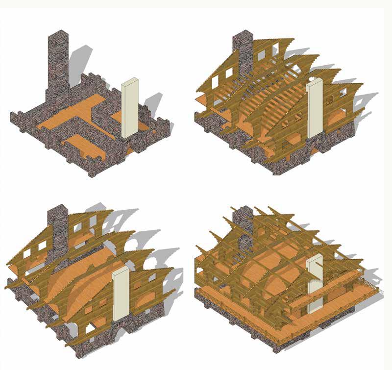 The shingles and boards of the roof are supported by 10-inch logs spaced at 3 feet resting on wood trusses.