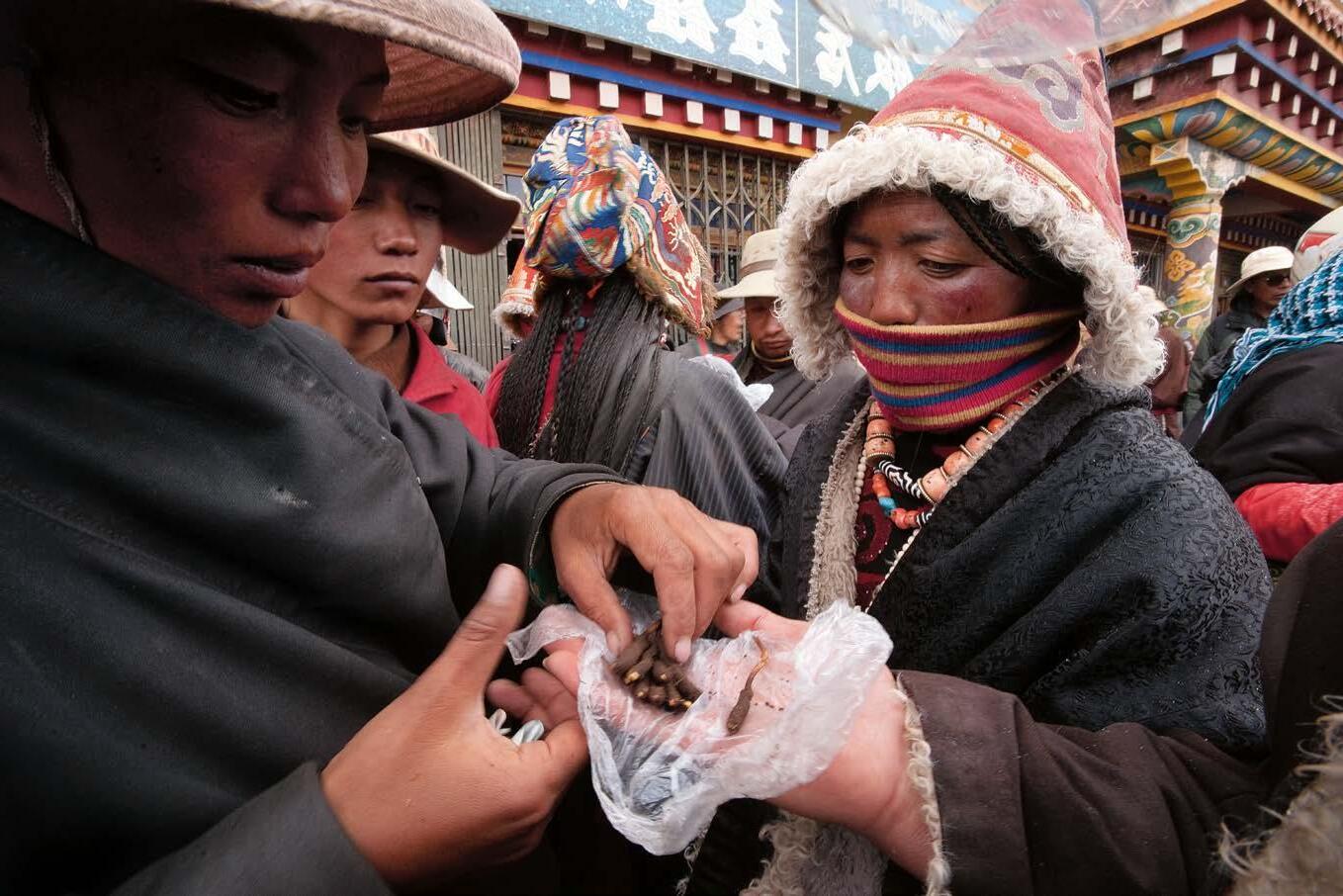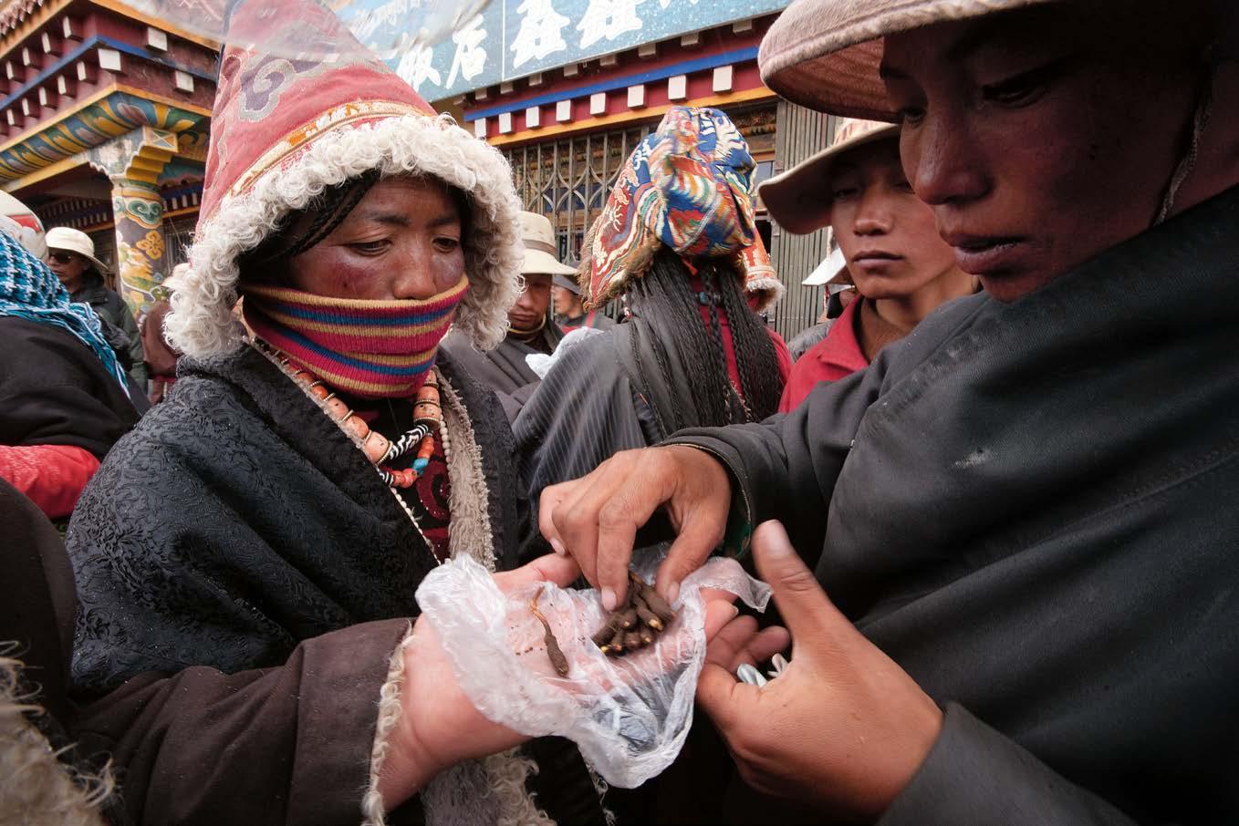 • 202-203 f resh from foraging for yartsa gombu on the grasslands , this nomad shows some P rime s P ecimens to traders