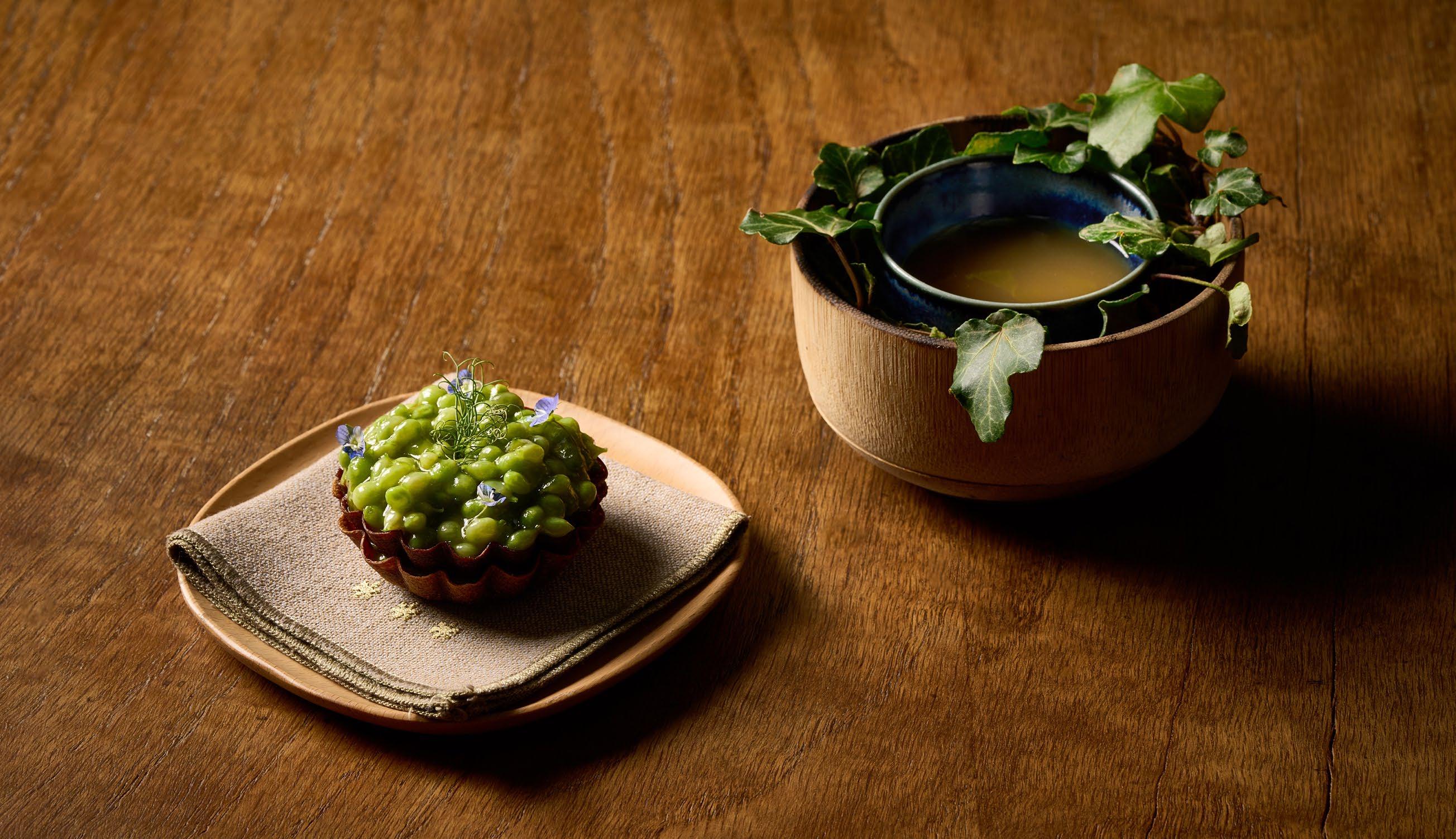 Presentation requires a wooden bowl with a wooden lid. Stick two tartlets together using a dab of chive emulsion. On top of the second tartlet, add more chive emulsion.
