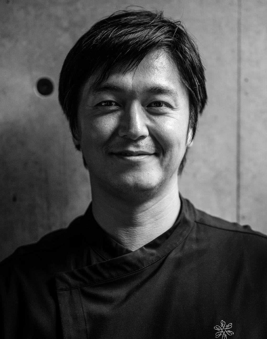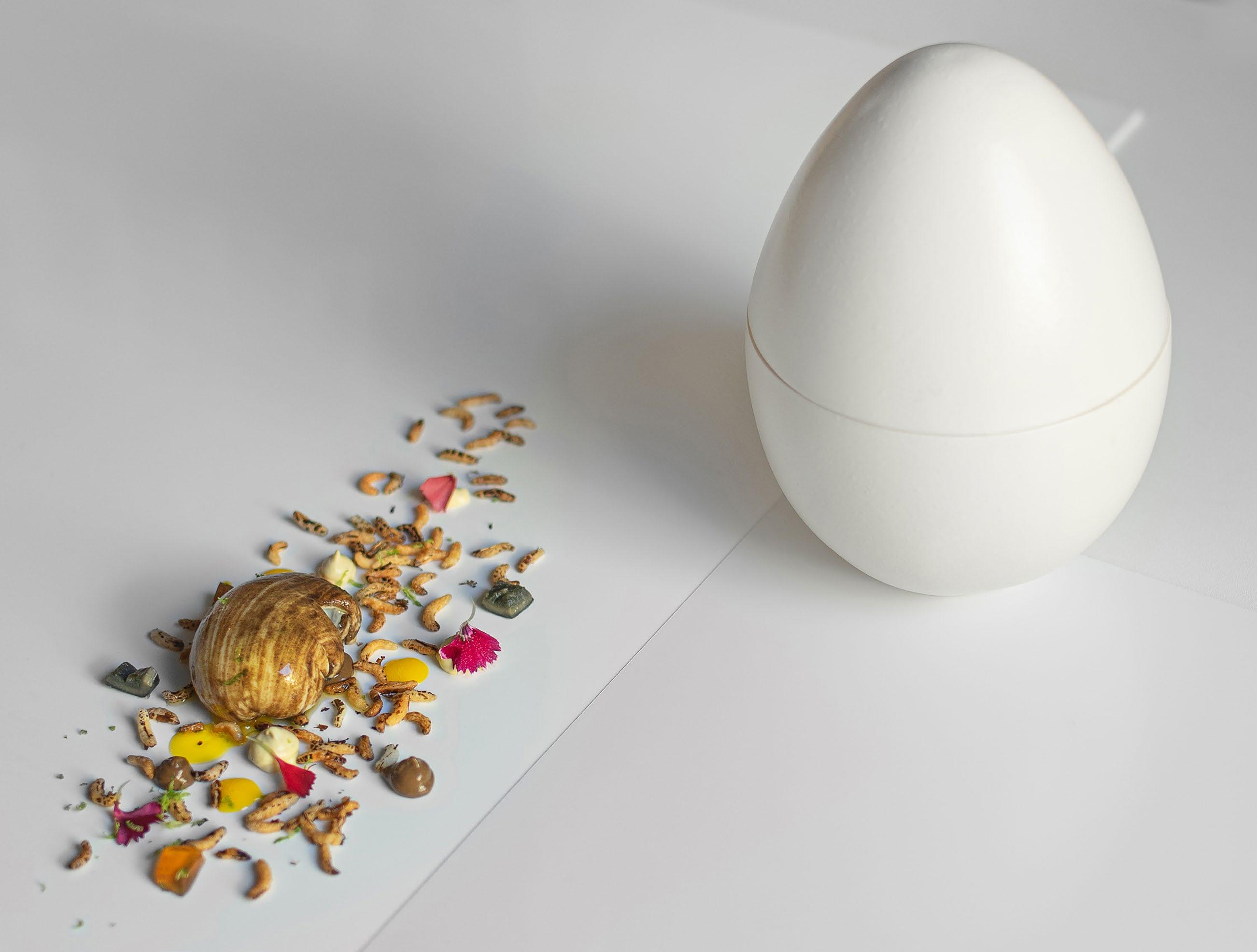 Boil the water and cook the eggs in the cling film for 4 minutes. Once the time is up, very carefully remove the cling film. Set the eggs aside. Place a teaspoon of the mushroom ‘praline cream’ and another of the goose liver mousse in the middle of a wide, shallow bowl. Arrange an egg on top. Place a few pieces of the century egg white next to it. Grate a little lime zest over the whole dish. Finally, arrange the fried zizania around the egg.