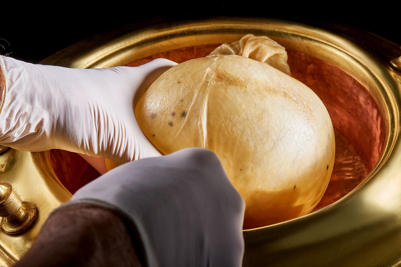 Soak the dehydrated pig’s bladder in cold water for about 10 days, changing the water daily. When the bladder is adequately hydrated, insert the other ingredients into it using a funnel, then firmly secure the bladder opening with kitchen twine.