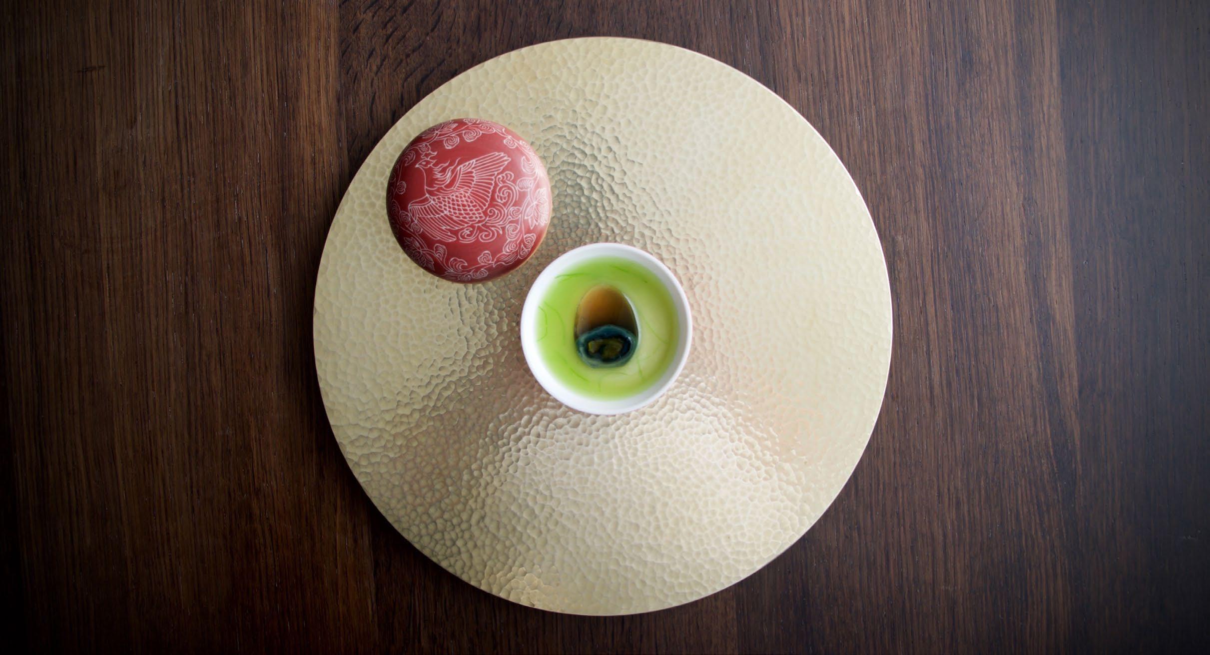 Place a dollop of chopped ginger in a small bowl, then add a large spoonful of heated potage on top. Cover the surface with the cabbage juice mixture. Season the egg half with the ginger pickling juice and salt, then place on top of the cabbage.