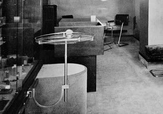 Rohr ist die kugelförmige Kalotte in einer Metallfassung befestigt. In das vertikale Rohr ist ein kleiner runder Glastisch eingeh ngt er Fu aus sich ü erlagernden Flachprofilen wirkt dagegen improvisiert.
