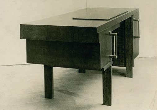 Ein bisher unbekannter Stahlrohrschreibtisch von Kálm n eng el ist in einer Fotografie dokumentiert, die sich im Nachlass seines Bruder László Lengyel erhalten hat. Auf der Rückseite ist der Abzug handschriftlich mit blauer Tinte on seiner he rau, a nal eng el Pataki, eschri tet „Schreibtisch 1928“. 4 |Abb. 7.5, 7.6 Der Stahlrohrschreibtisch ist s mmetrisch au ge aut mit seitlichen lage chen as aus mehreren eilstücken ge ildete, ügel rmig ge ogene tahlrohrgestell ist mit undkop schlit schrau en montiert, urnierte ischlerplatten dienen als r eits chen n seiner reduzierten Form erscheint der Schreibtisch etwas untypisch ür eng el, er diente wohl als rg n ungsmodell im elprogramm. Als Vorbild kann Marcel Breuers asymmetrischer Schreibmaschinentisch B21 von 1928 angesehen werden.5 eng el entwar auch einen heaterstuhl , der auf der Berliner Station der Ausstellung Der Stuhl im April 1929 im Lichthof des ehemaligen Kunstgewerbemuseums ge eigt wurde, heres ist u diesem elstück edoch nicht bekannt.6
