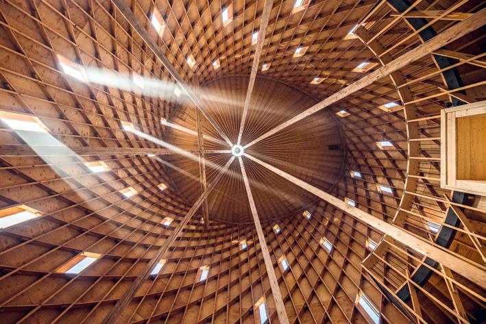 by the filigree wood construction and narrow windows. Sunlight permeates the interior, guiding the eyes upwards and emphasising the spiritual dimension of the space. You can experience the sensual interplay of light, acoustics and fragrance.