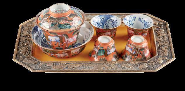 3.75 A “Chinese-style” tea set comprising a large lidded cup in a bowl together with four teacups, each decorated with horses on an orange ground, with the interior decorated with a floral design in blue and white, all set on a silver gilt eight-sided tray depicting various mythical and real animals, late 19th century. L: 30 cm, W: 20 cm