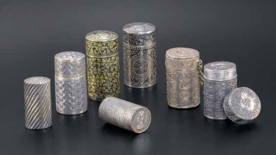 3.68 A group of five silver ya dom inhalers, each decorated in a different pattern, together with a black niello ya dom inhaler and a gilded silver niello ya dom inhaler, late 19th and early 20th century. Height from 3.8-5 cm