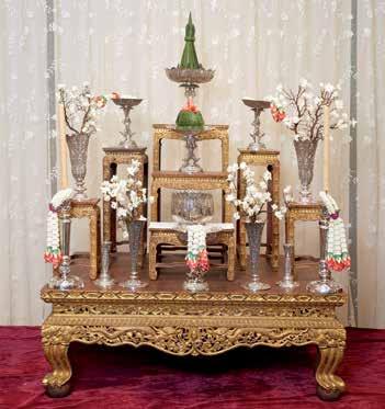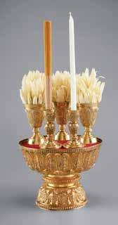 Other offerings to the temple include a range of items in silver that demonstrate the donor’s faith27 and desire to make merit; these include images of the Buddha’s footprint, figurines depicting characters from the Ramakien, elephants with or without lotus leaves, conch shells adorned with silver that are considered to bring good luck, silver plates etched with the Buddha’s image, miniature silver boats that symbolise passage,28 pedestal trays for presenting offerings and a wide variety of other utensils.