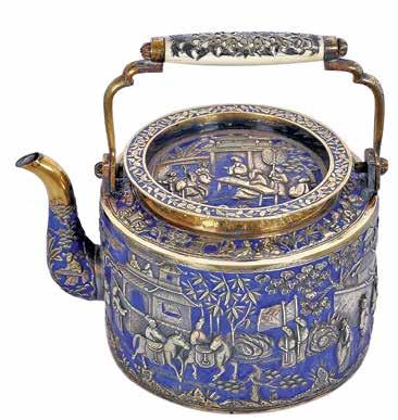 7.11 A silver gilt water-pot, the cylindrical body embossed with figures engaged in various pursuits, on horseback, fishing and carrying flags, in a forest setting on a deep blue enamel ground, the handle with an ivory fitting inlaid with a silver floral design, ‘Da Xing’ mark, 19th century. H: 17.5cm, L: 18.8 cm (Michael Backman Collection)