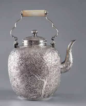 3.72 A very large spherical water-pot with bone handle and silver knob, decorated with large birds flying amidst acacia trees and foliage, with a bamboo pattern on the spout, ‘Hui Yuan’ mark, late 19th- early 20th century. H: 32.5 cm, D (base): 11.5 cm (Béatrix Dayde Latham Collection)