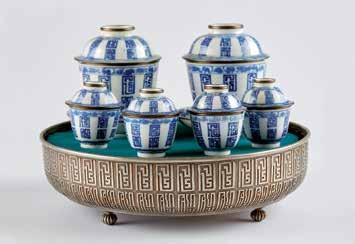 7.14 A blue and white “Jibo” tea set, comprising four lidded teacups and two larger lidded teacups on saucers all set on a matching round silver tray. Each item is decorated with the “Chor Bor Ror” cipher of King Rama V in the yi son design, late 19th century. D (tray): 26 cm, 906 g