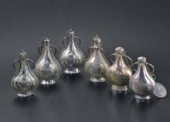 5.14 Six pear-shaped silver snuff bottles incorporating King Rama V medallions on front and back. Each is incised with royal emblems and the “Chor Bor Ror” cipher of King Rama V. Height of bottles ranges from 7-7.5 cm