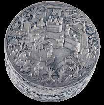 7.10 A silver betel box, decorated on the cover with scenes of literati life and the sides covered with military scenes most likely from the Three Kingdoms (San Guo) period, ‘Da Xing’ mark, 19th century. H: 6.5 cm, D: 14 cm, 578 g