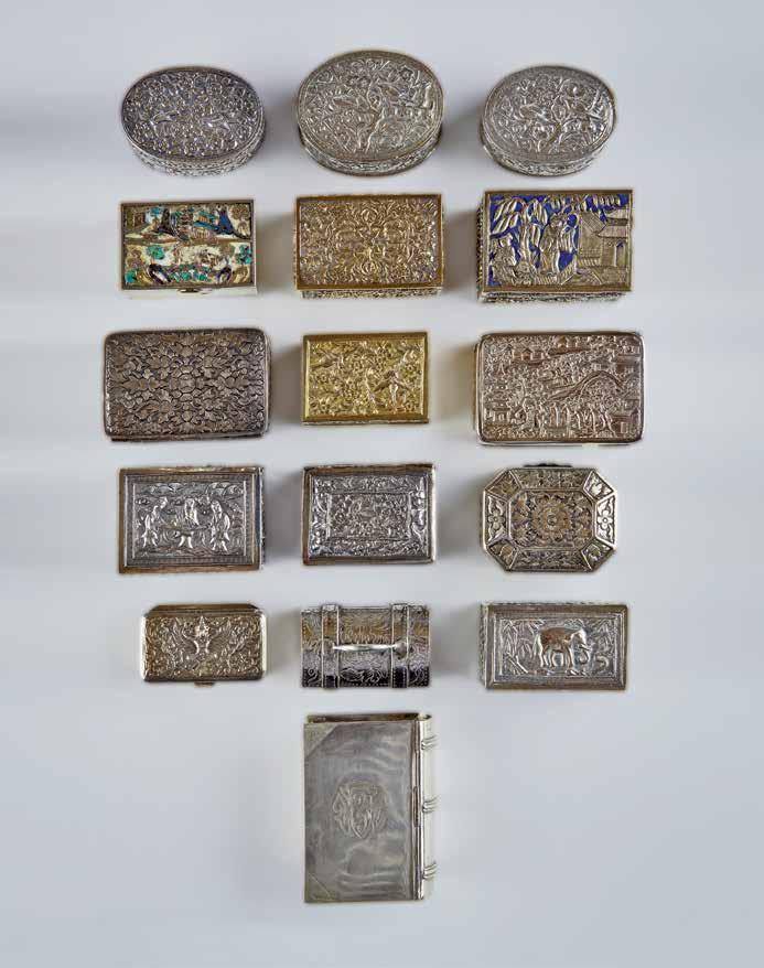 The term “ya dom”, which literally means “smell medicine”, could pertain to the ingestion of snuff, but now usually refers to inhalants, often containing camphor, a variety of herbs or even peppermint, that are used to ease a blocked nose. Found in silver and niello, as well as aluminium cleverly emulating silver, inhalers rarely have maker’s marks on the bottom.