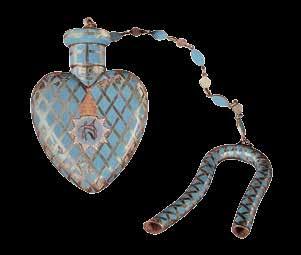 Although made to stand, most incorporate an overhead loop for wearing on a belt. The stopper is technically an advance, as it is a unique combination of the cap top and the Chinese-style cork and spoon so that the neck is gripped by the stopper both from outside and inside the bottle. A curb chain is also fitted to the stopper. This would have prevented the bottle from easily spilling expensive snuff onto the floor.
