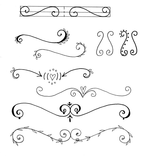 4. Curled accents and scrolls, which require some preparatory sketches for them to be symmetrical: