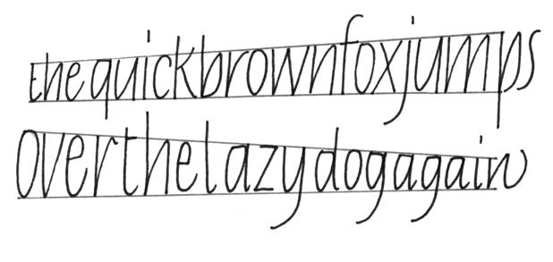 Draw two guidelines, then write the sentence “The quick brown fox ...” on each guideline in lowercase chancery, without any spaces between the words. Try to make sure that the sentences are the same length.