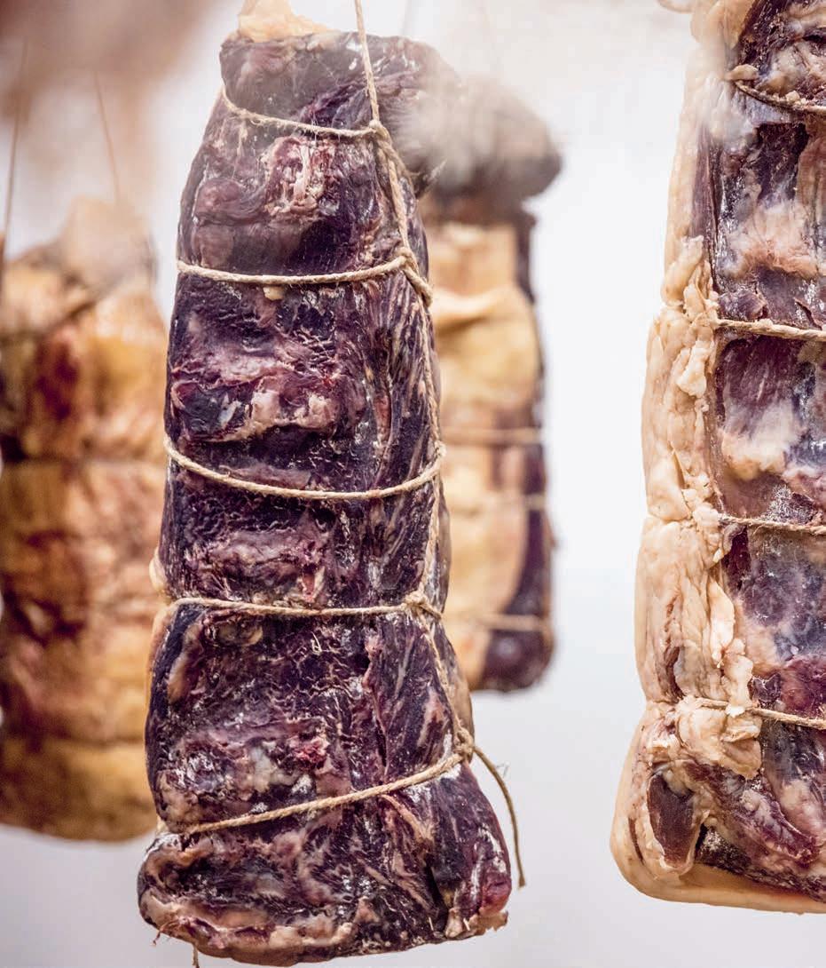 Anyone who comes to eat at Carcasse sits down at one of the long, inviting communal tables to enjoy the food that’s about to be served. Traditional red and white checked kitchen towels are used in place of napkins. You can see the Josper charcoal grill in the open kitchen. A largerthan-life butcher’s block, an antique slicing machine and the stainlesssteel butcher’s tables along the walls immediately catch the eye. The authentic atmosphere of a butcher’s shop – carcasses, meat hooks, knives, cleavers, whole hams and white ceramic tiles – is immediately evident and blends seamlessly with the building’s concrete walls and industrial vibe. The finishing touch is a rail on which the cuts of meat quarters can be pushed into the restaurant from the butcher’s shop. It doesn’t get more basic than this.