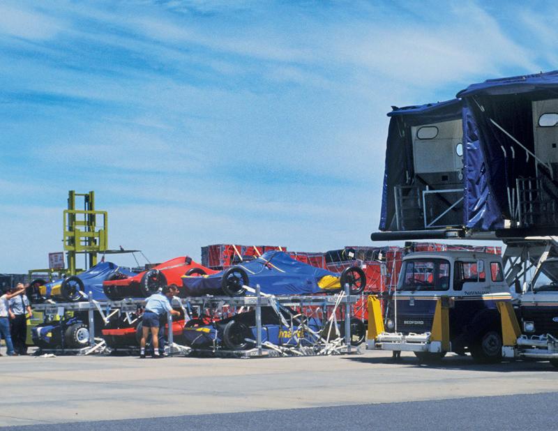 Formula 1 cars waiting to be loaded onto a cargo plane bound for a Grand Prix outside Europe